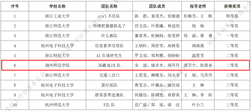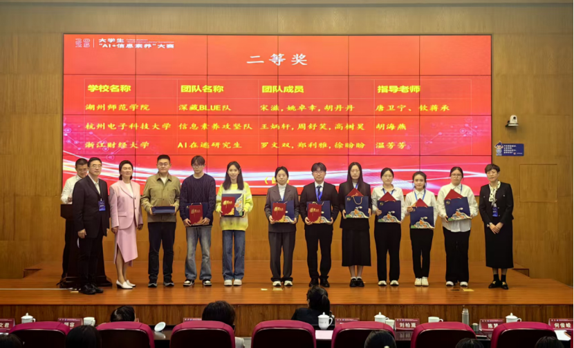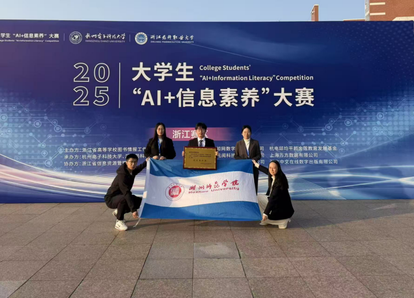 发布时间:2025-11-20 | 点击量:139 11月15日,由浙江省高等学校图书情报工作指导委员会主办的浙江省大学生“AI+信息素养”大赛暨2025年大学生“AI+信息素养”大赛浙江赛区决赛在杭州电子科技大学落下帷幕。图书馆联合教务处、研究生院积极组织学生参赛,经过校赛、省赛淘汰赛的层层选拔,最终研究生团队“深藏BLUE队”成功晋级省赛决赛,并在激烈角逐中脱颖而出,荣获研究生组二等奖,名列省内硕士点高校第一名。唐卫宁教授与钦蒋承老师作为该团队的指导教师,荣获“优秀指导教师奖”,湖州师范学院图书馆荣获“优秀组织奖”,展现了图书馆“AI+信息素”教育教学能力和竞赛组织能力。