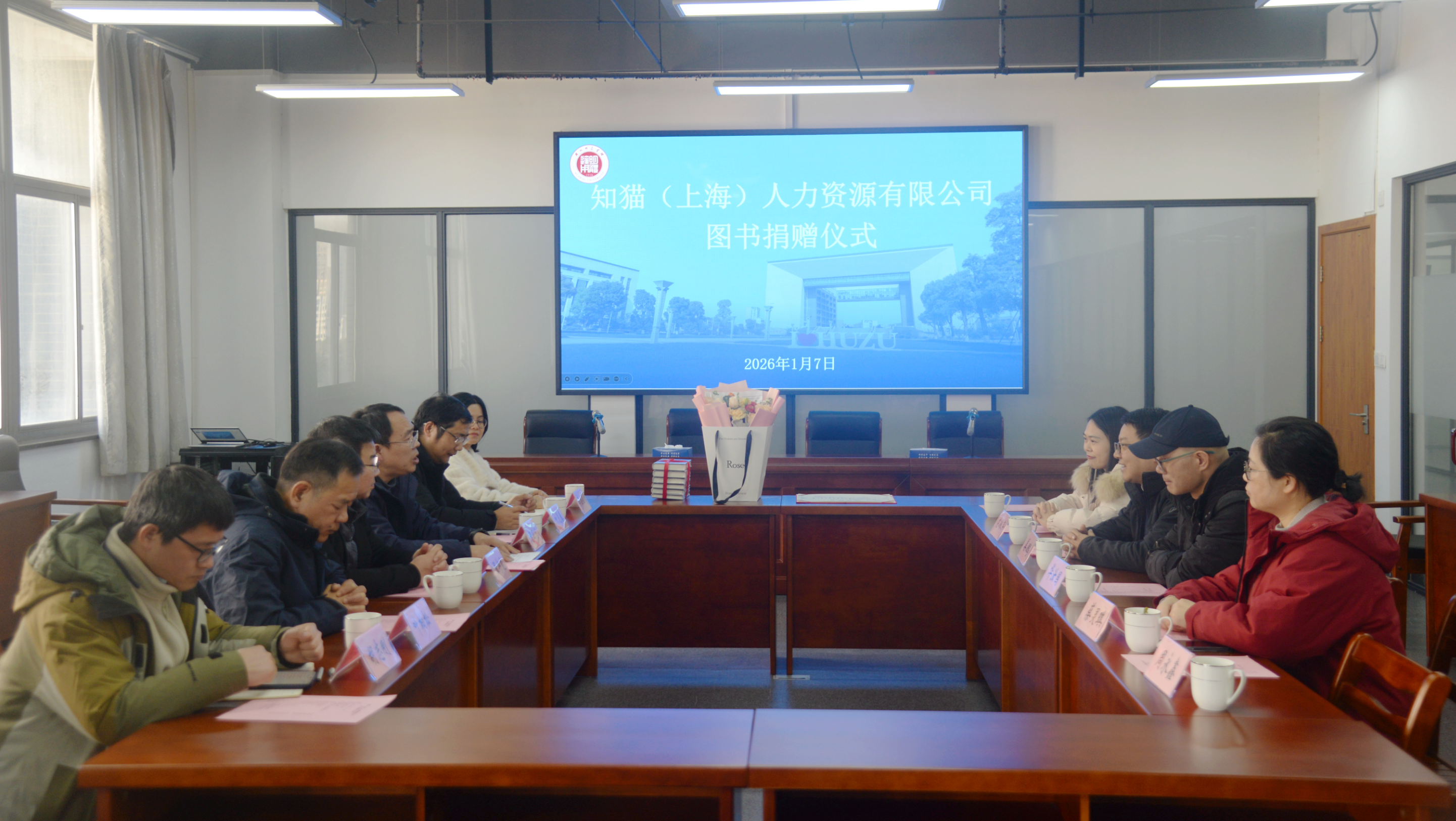 发布时间:2026-01-08 | 点击量:2361月7日下午,知猫(上海)人力资源有限公司图书捐赠仪式在东校区图书馆A615会议室举行,知猫公司董事长姜鹏、华汝国博士及湖州分公司负责人左冰芹等一行六人出席捐赠仪式,馆长唐卫宁、副馆长张坤能及相关部室负责人共同参会。仪式由副馆长张坤能主持。